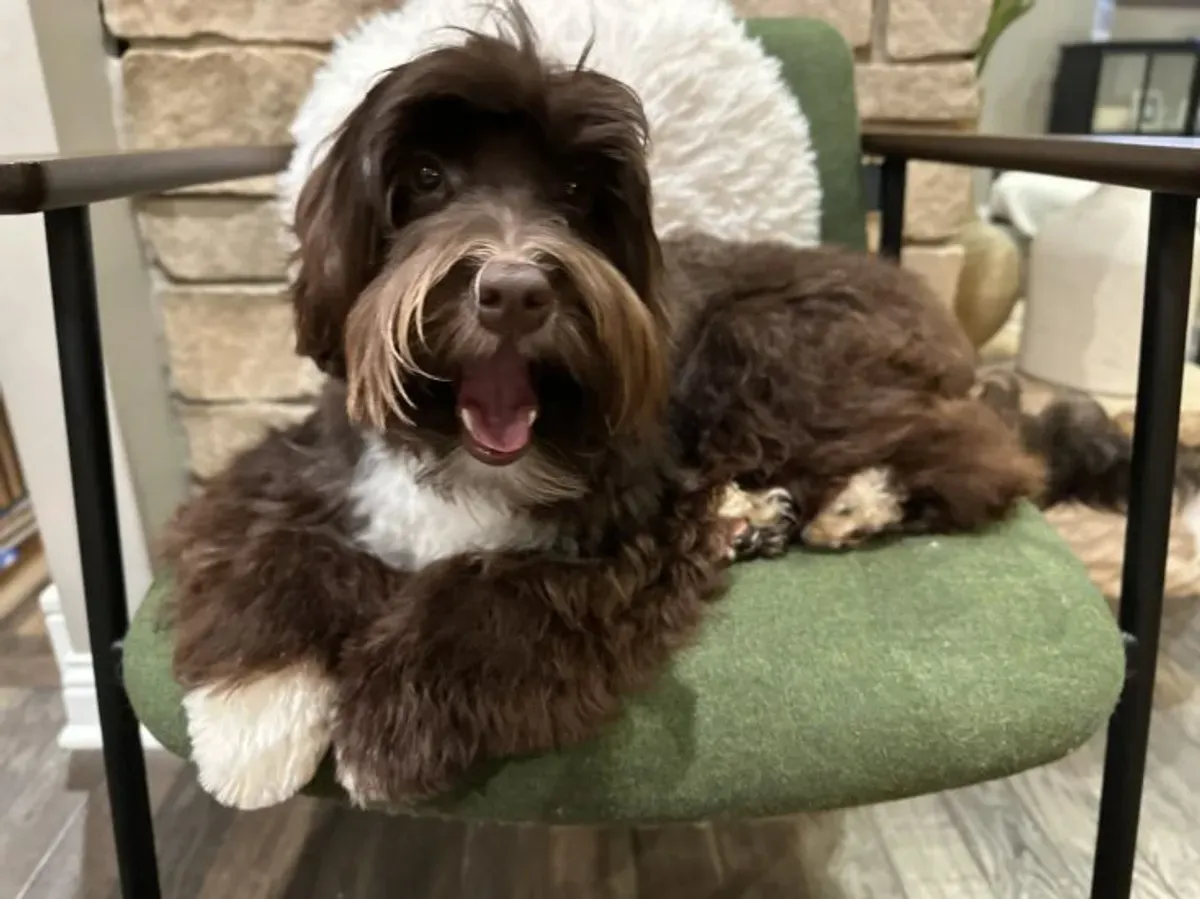 Roo is 15 pounds with the sweetest chocolate coat with white markings. She has a loose, wavy, fleece coat. Roo, in one word, is a pal! She is a dog whose only agenda is whatever John wants to do…she’s his biggest fan! She’ll happily follow and play or lay on the couch all day. Her versatile personality makes her the perfect pal for any family environment and her “put her in your pocket” size makes her ideal for therapy dog work, travel, etc. Roo has a confident moderate level of energy with a happy girl vibe. She has enough fun in her to keep up with the kids but does not require a great deal of activity and could easily hang around with an older crowd as snuggling is always high on her priority list. Her temperament is what we like to call “vanilla”…the perfect flavor that EVERYONE loves and it goes with anything! She is sweet and adaptable to any setting.