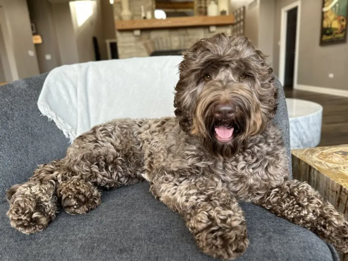 Birkin is our big, beautiful standard chocolate girl, and her heart is as big as her paws! Birkin is that slow-moving, gentle, and very mellow personality and that you would expect from a standard-sized Australian Labradoodle. She is at the smaller end of the standard-sized range, at 45 pounds and 21″ at the shoulder, presenting as a big but not TOO big beautiful dog. As if that wasn’t enough to celebrate, Birkin scored an OFA EXCELLENT for her hip score, not just as a preliminary puppy result but as her final score based on adult x-rays and the opinions of three impartial veterinarians from the OFA. An “excellent” score is hard to come by and most definitely cause for applause, especially with her larger size! With beauty, health, AND an outstanding calm temperament, she is the total package.