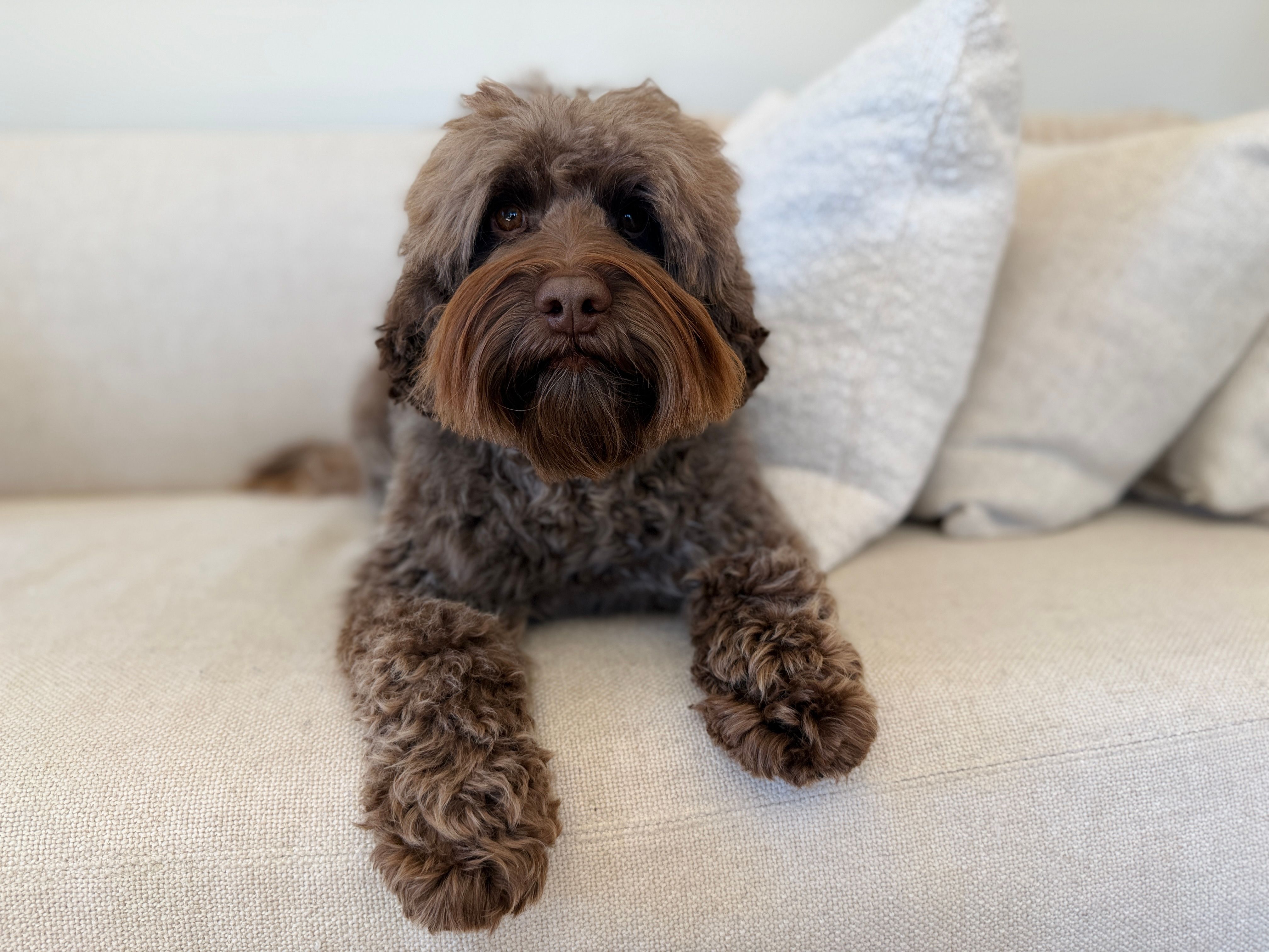 Rocky is a head-turning 30-pound Australian Labradoodle with a gorgeous low maintenance chocolate coat and eyes the color of liquid gold—light brown with a golden warmth that will melt your heart. His tail is unlike any other: soft, full, and straight, with a silky texture you’ll never forget. What makes Rocky truly special isn’t just his beauty, but his spirit. He carries himself with a quiet humility, always sitting patiently and waiting for anyone willing to offer an ear rub. And when that moment comes, he leans in and melts right into your hands. Rocky walks like a perfect gentleman on the leash, rarely ever barks, and treats everyone, human or canine, with the utmost respect. He has a gift for blending seamlessly into any setting, making friends wherever he goes. Whether in the company of other dogs or surrounded by people, Rocky is every heart’s best friend.